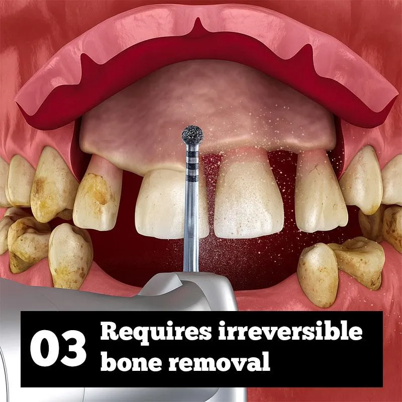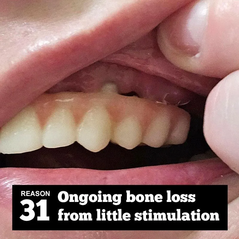 During surgery, the dentist removes bone and gum tissue to make space for the bulky prosthetic. This damage is irreversible.