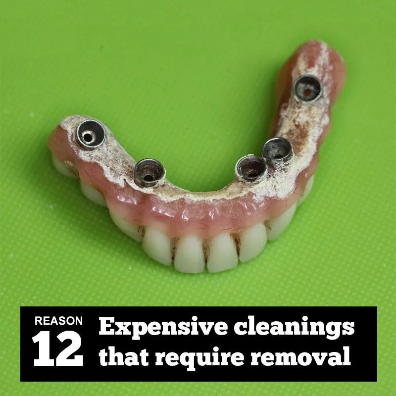 Food will buildup under the prosthetic which can be difficult to clean at home. Patients should have their All-on-4 removed annually for a professional cleaning.